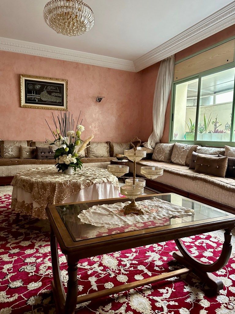 A traditional Moroccan living room- note the sofa lining the perimeter of the room