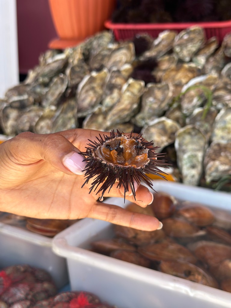 Soon after, we travelled to the town of Ouilidia (way-lee-di-yuh), a pleasant beach town and local favorite. There Sofia introduced me to her favorite oyster stall and the two of us enjoyed some of the freshest oysters (and sea urchin!) of the season.